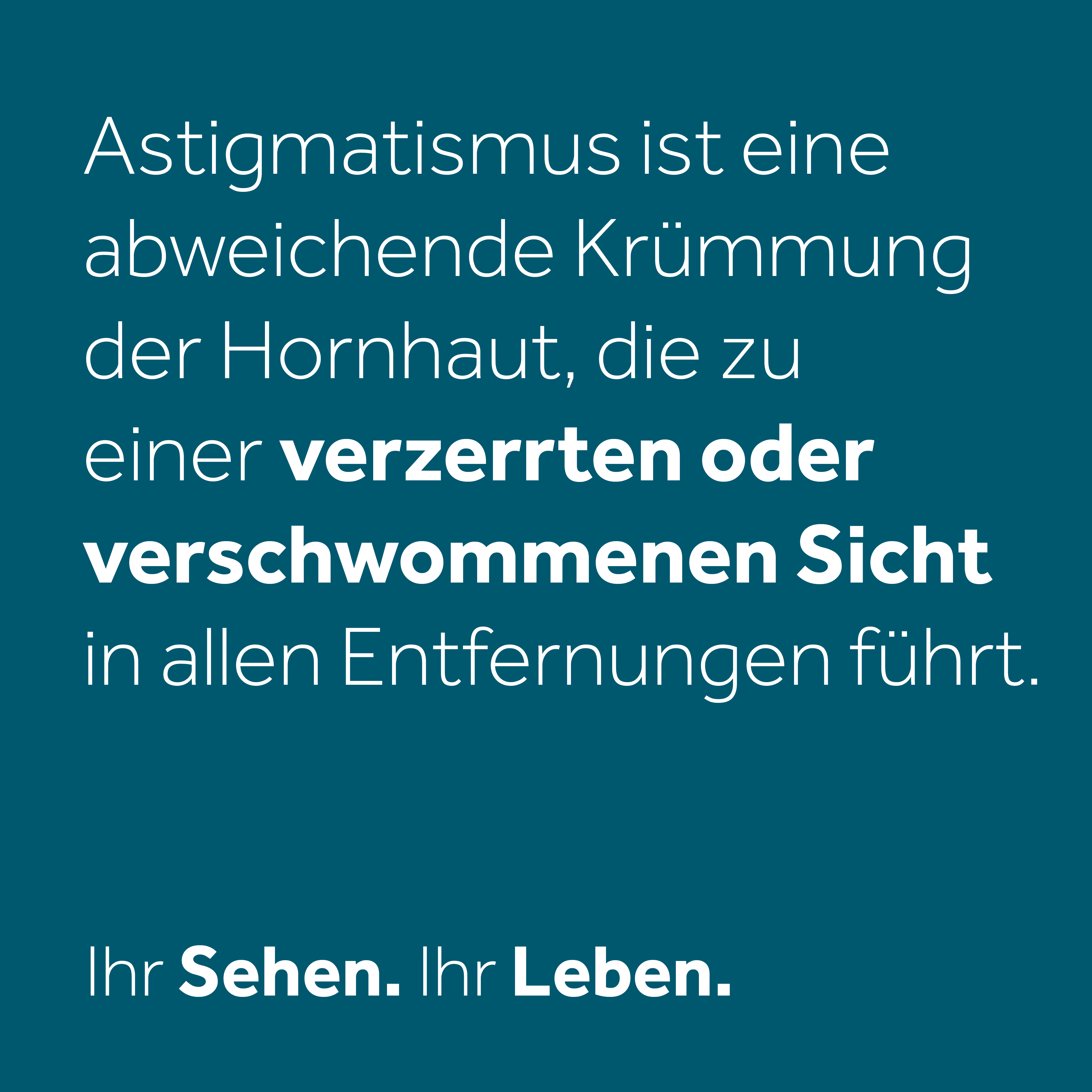 Hornhautverkrümmung (Astigmatismus) geht in der Regel mit Myopie (Kurzsichtigkeit, bei der nahe Objekte klar, entfernte Objekte jedoch unscharf erscheinen) oder Hyperopie (Weitsichtigkeit, bei der entfernte Objekte klar, nahe Objekte jedoch unscharf erscheinen) einher.