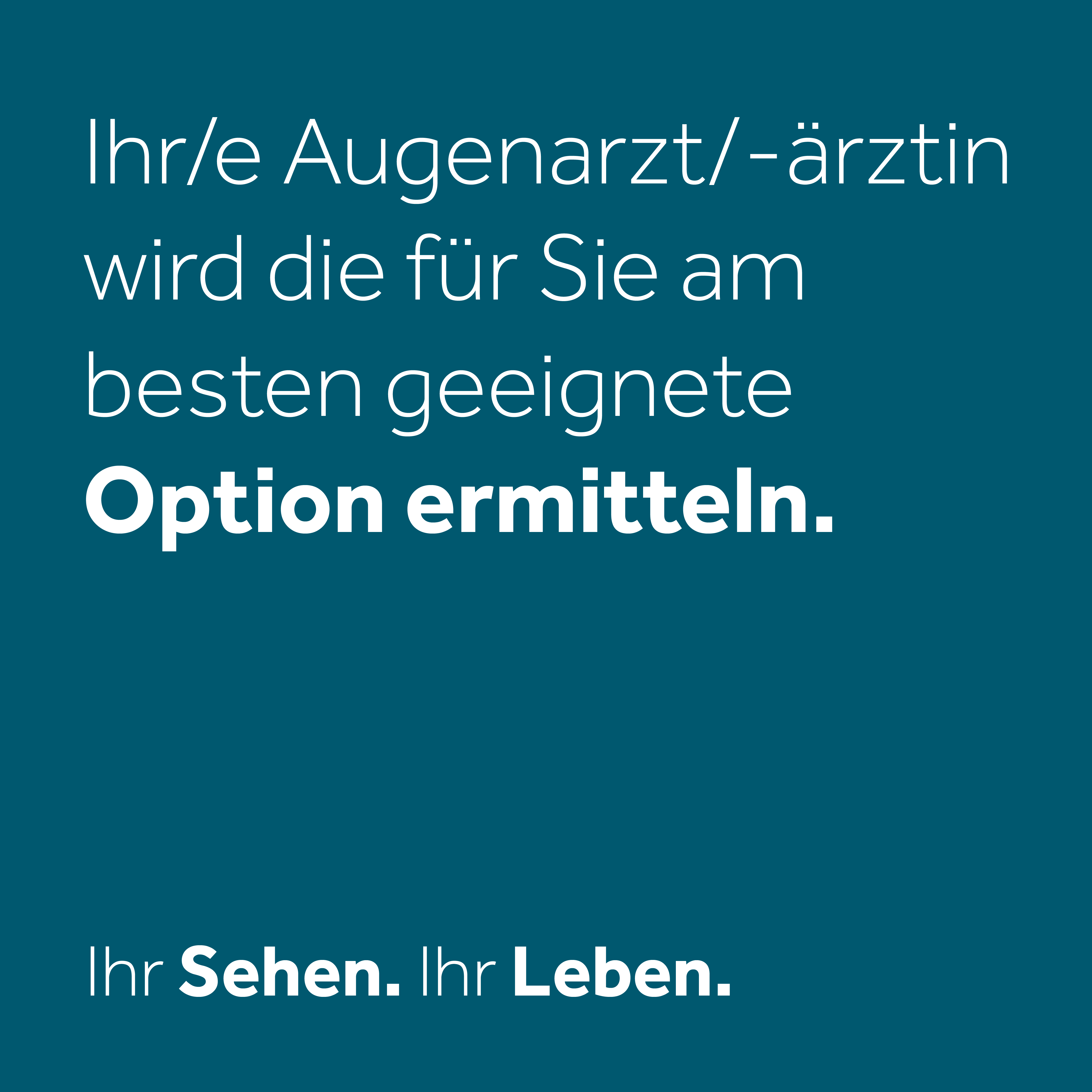 • Ihr/e Augenarzt/-ärztin wird die für Sie am besten geeignete Option ermitteln. Während der Untersuchung werden verschiedene Messungen Ihrer Augen und Ihrer Sehkraft vorgenommen und auch Ihre Lebensgewohnheiten werden besprochen, um zu gewährleisten, dass Ihnen die richtige Lösung empfohlen wird.