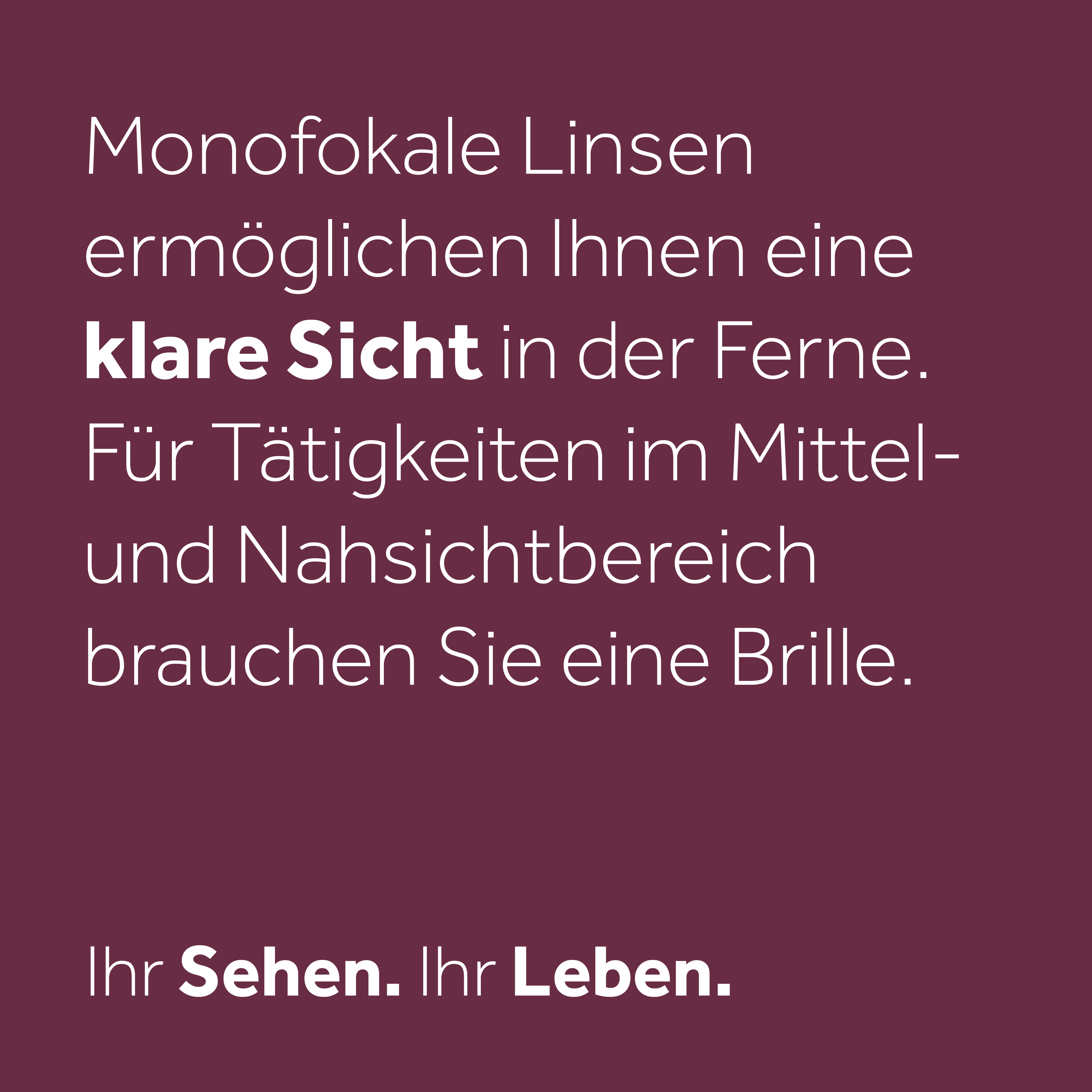 Eine monofokale IOL hat einen einzigen Brennpunkt, mit dem Sie in der Regel nur in der Ferne scharf sehen (z. B. beim Autofahren, Radfahren oder Fernsehen). Für Tätigkeiten im Mittelsichtbereich (z. B. Computerarbeit oder andere Aktivitäten auf Armlänge) und im Nahsichtbereich (z. B. Lesen, Schreiben, Telefonieren) müssen Sie eine Brille tragen.