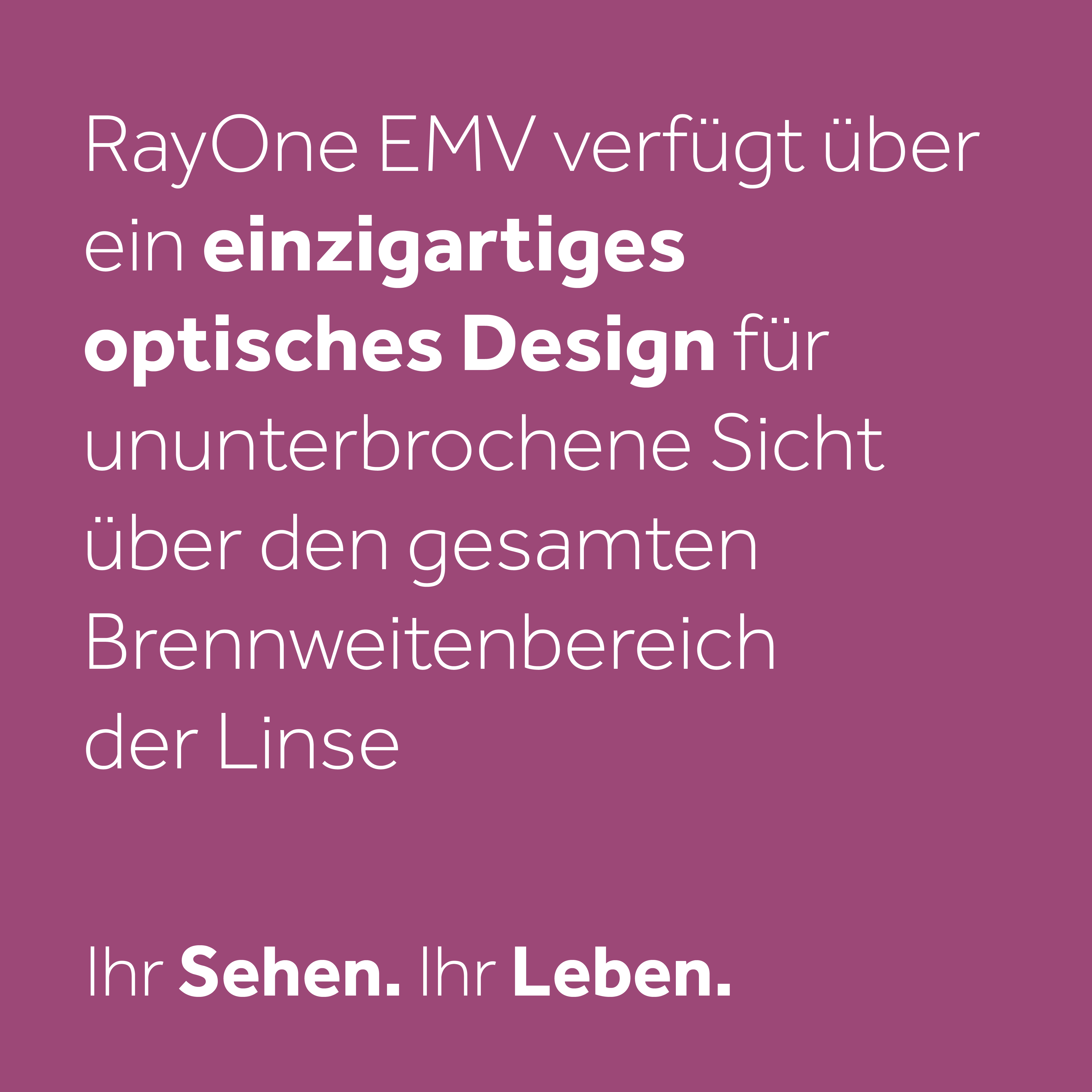 RayOne EMV verfügt über ein einzigartiges optisches Design, das eine ununterbrochene Sicht über den gesamten Brennweitenbereich der Linse bietet und die nicht scharf fokussierte Zone (NSFZ) verringert.5 Die RayOne EMV wurde außerdem so konzipiert, dass es bei schlechten Lichtverhältnissen4 eine klarere Sicht bietet und im Vergleich zu herkömmlichen Monofokallinsen Ihre Sehqualität bei Aktivitäten im Nahbereich verbessern kann.5