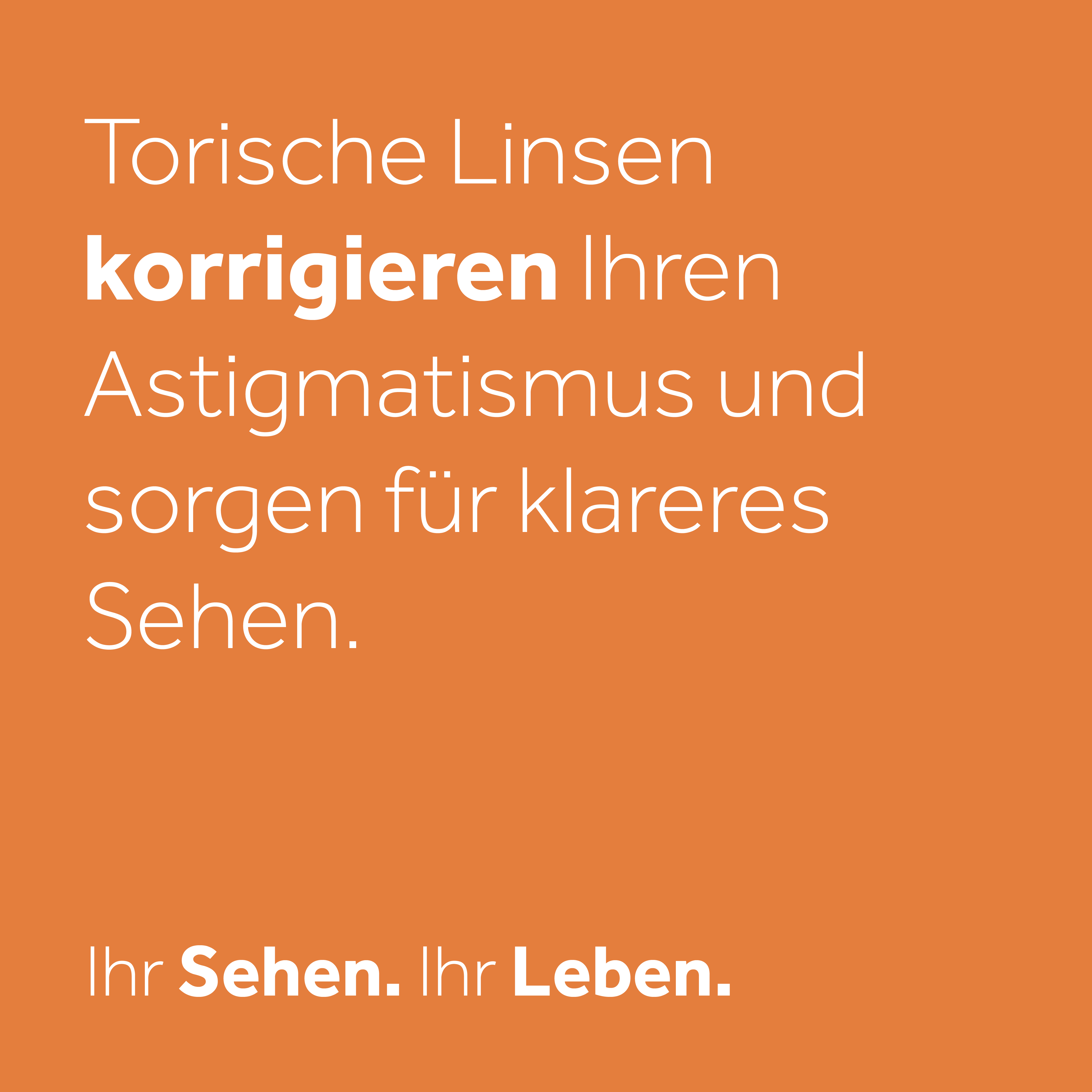 Wenn Sie an Astigmatismus leiden, also einer abweichenden Krümmung der Hornhaut, die zu einer verzerrten oder verschwommenen Sicht in allen Entfernungen führt, dann empfiehlt Ihnen Ihr/e Augenarzt/-ärztin möglicherweise eine torische IOL. Das spezielle Oberflächendesign einer torischen IOL korrigiert den Astigmatismus und bietet Ihnen klareres Sehen.
