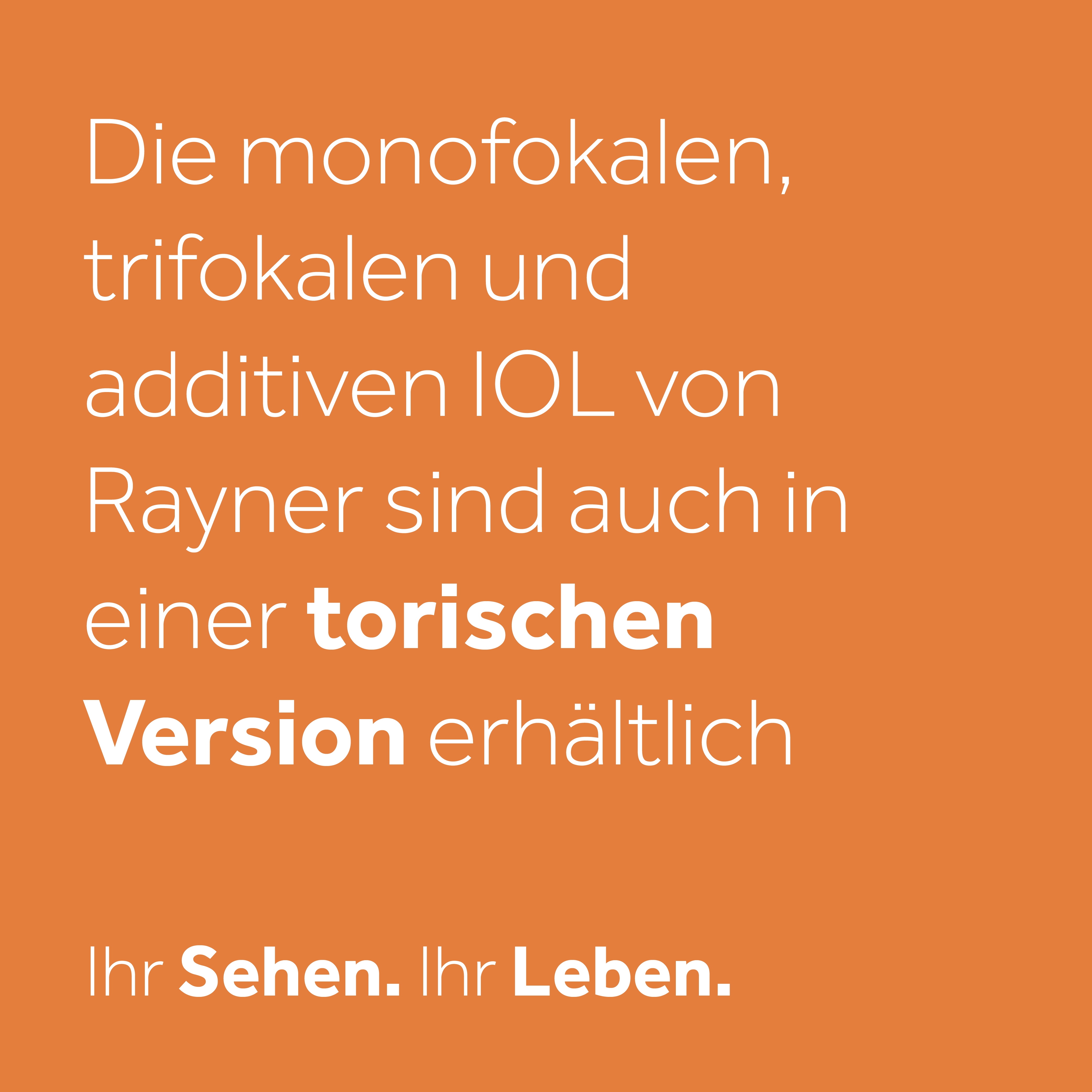 Die monofokalen, trifokalen und additiven IOL von Rayner sind auch in einer torischen Version erhältlich: